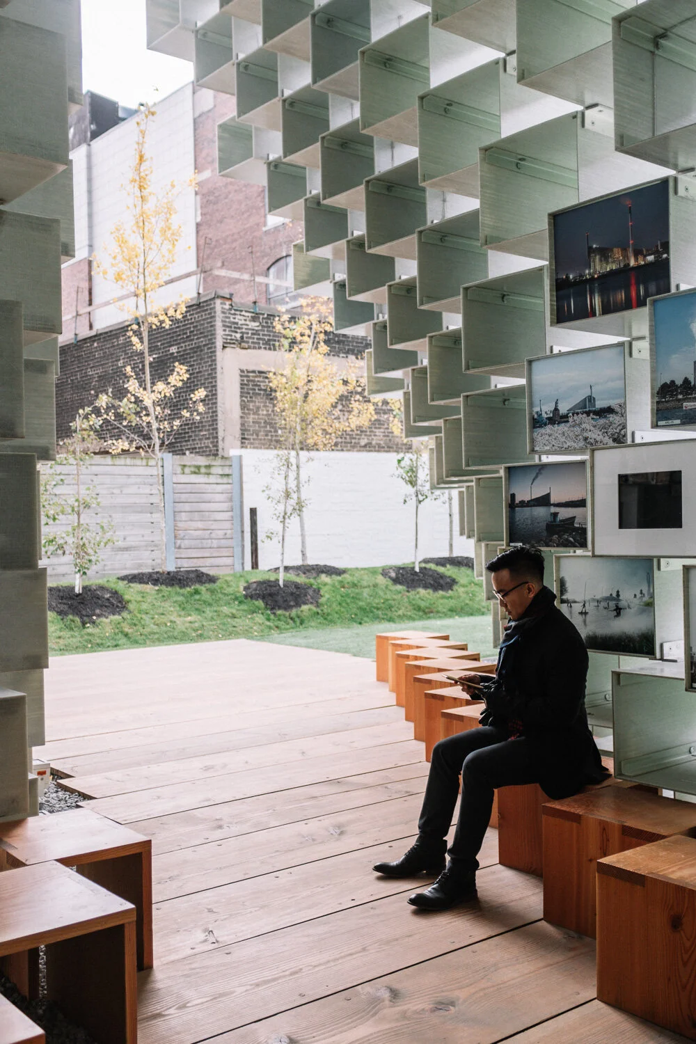 A person sitting on a wooden bench in a modern, open-air space with shelves holding framed photographs of cityscapes and water. Small trees and a wooden fence are visible in the background.